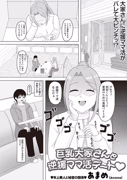 家賃を滞納気味の谷吉君は逆援ママ活が巨乳大家さんにバレちゃった!罰として大家さんとの1日デートをするが楽しい時間についお酒も飲みすぎてしまい気がついたらラブホに!?もちろん何も起きないはずもなく足りない家賃はカラダで…と大家さんが彼のモノを攻めたてる★すると彼女からの着信に大ピンチ!?彼女の要求に嫌気がさした谷吉君はスマホの電源を切ると…★