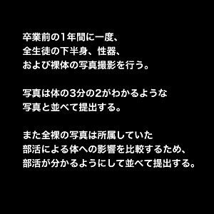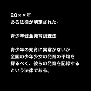青少年健全発育調査法 青少年の発育に異常がないか 全国の少年少女の発育の平均を 探るべく、彼らの発育を記録する という法律である。