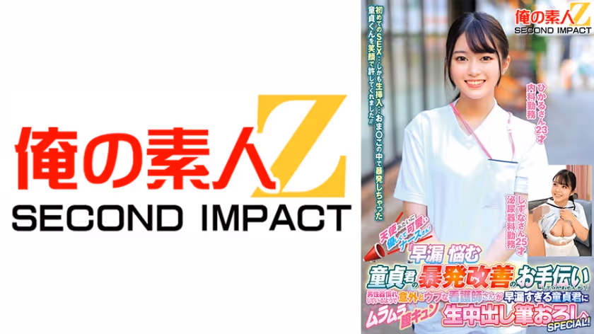 ひかるさん(23)内科勤務。しずなさん(25)泌尿器科勤務。今日も患者のためにご奉仕する可愛くて巨乳な看護師さん。日々の仕事で男性器は見慣れているようですが、童貞君のびくびく脈打つ敏感チンポを前に、発情。早漏を改善するべく、献身的な手コキ、フェラチオ、素股でトレーニング。完全に膣キュン越えて膣ギュンしちゃって、中出し筆おろし性交に成功。白衣の天使がここにいました。